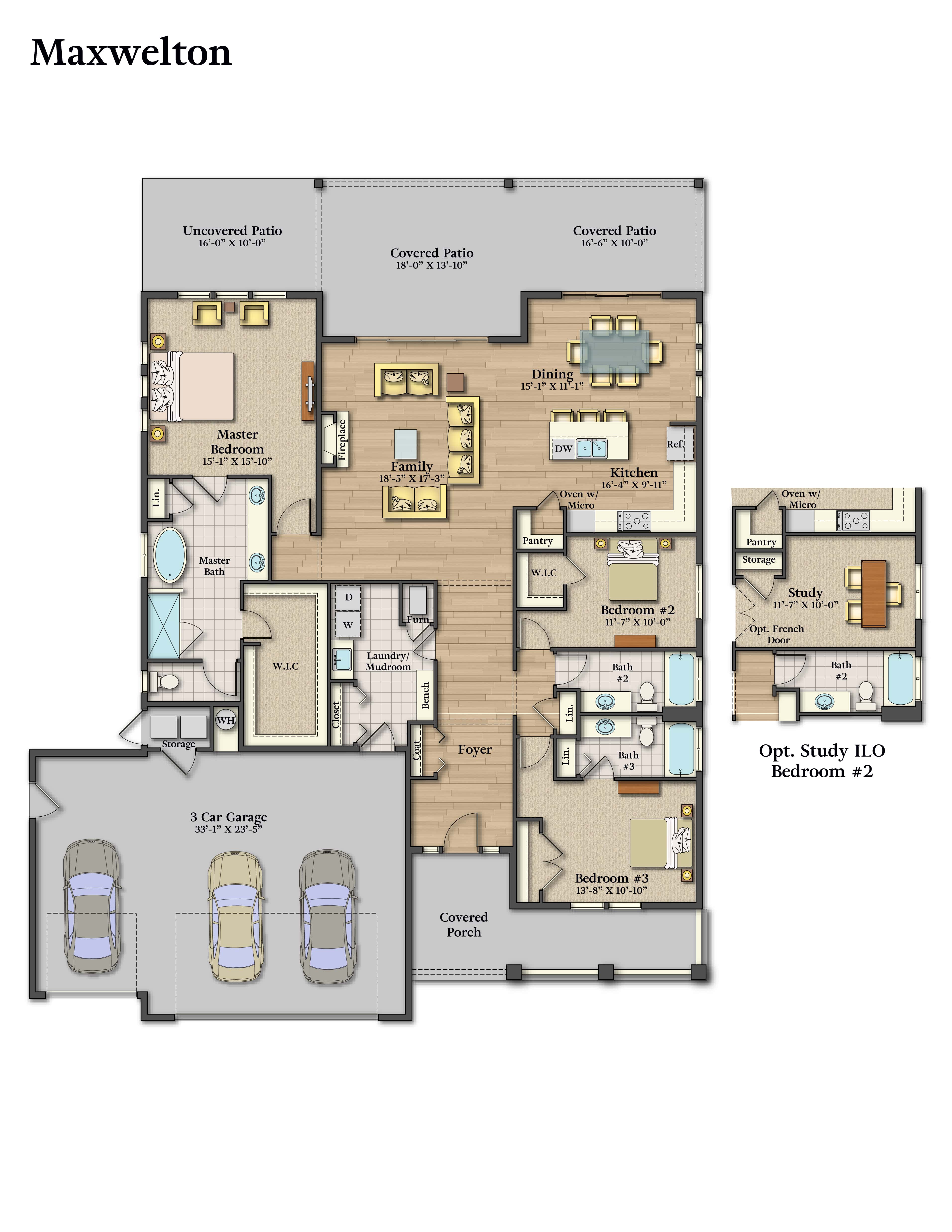 Our cozy single level Maxwelton floor offers 2,267 SF, 3 bedroom/3 baths with an optional study. Bedroom #3 has its own private bathroom, perfect for guests. Open concept kitchen, dining room, & living room are vaulted leading out to a large, covered patio with fire pit. Perfect for entertaining and relaxing with family & friends.